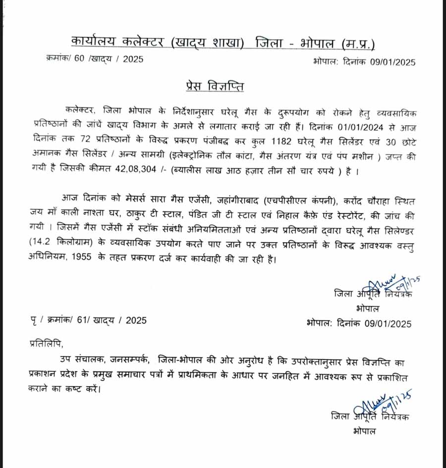 आज खाद्य विभाग की टीम ने मेसर्स सारा गैस एजेंसी, जहांगीराबाद (एचपीसीएल कंपनी) और करोंद चौराहा स्थित जय माँ काली नाश्ता घर, ठाकुर टी स्टाल, पंडित जी टी स्टाल, और निहाल कैफ़े एंड रेस्टोरेंट में जांच की।गैस एजेंसी में स्टॉक संबंधित अनियमितताएं पाई गईं।अन्य प्रतिष्ठानों में घरेलू गैस सिलेंडर (14.2 किलोग्राम) का व्यवसायिक उपयोग करते हुए पाया गया। इन मामलों में आवश्यक वस्तु अधिनियम, 1955 के तहत प्रकरण दर्ज कर आवश्यक कानूनी कार्रवाई की जा रही है।