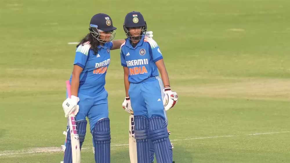 101 के स्‍कोर पर भारत को दूसरा झटका लगा। हरलीन देओल ने 32 गेंदों पर 20 रन बनाए। 21वें ओवर में जेमिमा रोड्रिग्स पवेलियन लौटीं। युवा बल्‍लेबाज प्रतीका रावल शतक से चूक गईं। उन्‍होंने 96 गेंदों पर 89 रन ठोके। इस दौरान प्रतीका ने 10 चौके और 1 छक्‍का लगाया। तेजल हसब्निस 53 रन और ऋचा घोष 8 रन बनाकर नाबाद रहीं।