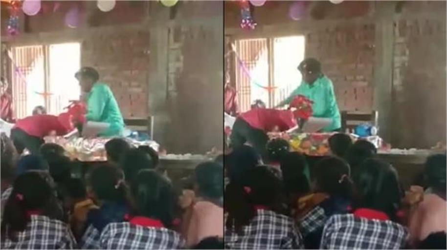 वीडियो में एक स्कूल की क्लास में कुछ बच्चे अपने शिक्षक के साथ टीचर्स डे मना रहे ते कि इस दौरान क्लास रूम में लगे गुब्बारे, साज सज्जा और बच्चों की भीड़ में एक स्टूडेंट स्नो सप्रे लेकर आया और अध्यापक पर सप्रे करने लगा जिस पर टीचर इतना भड़क गए कि उन्होंने स्टूडेंट की शर्ट पकड़ घसीटते हुए बाल खींच और पीठ पर ताबड़तोड़ थप्पड़ बरसाए। इसके बाद से सेलिब्रेशन का माहौल काफी गंभीर हो गया।