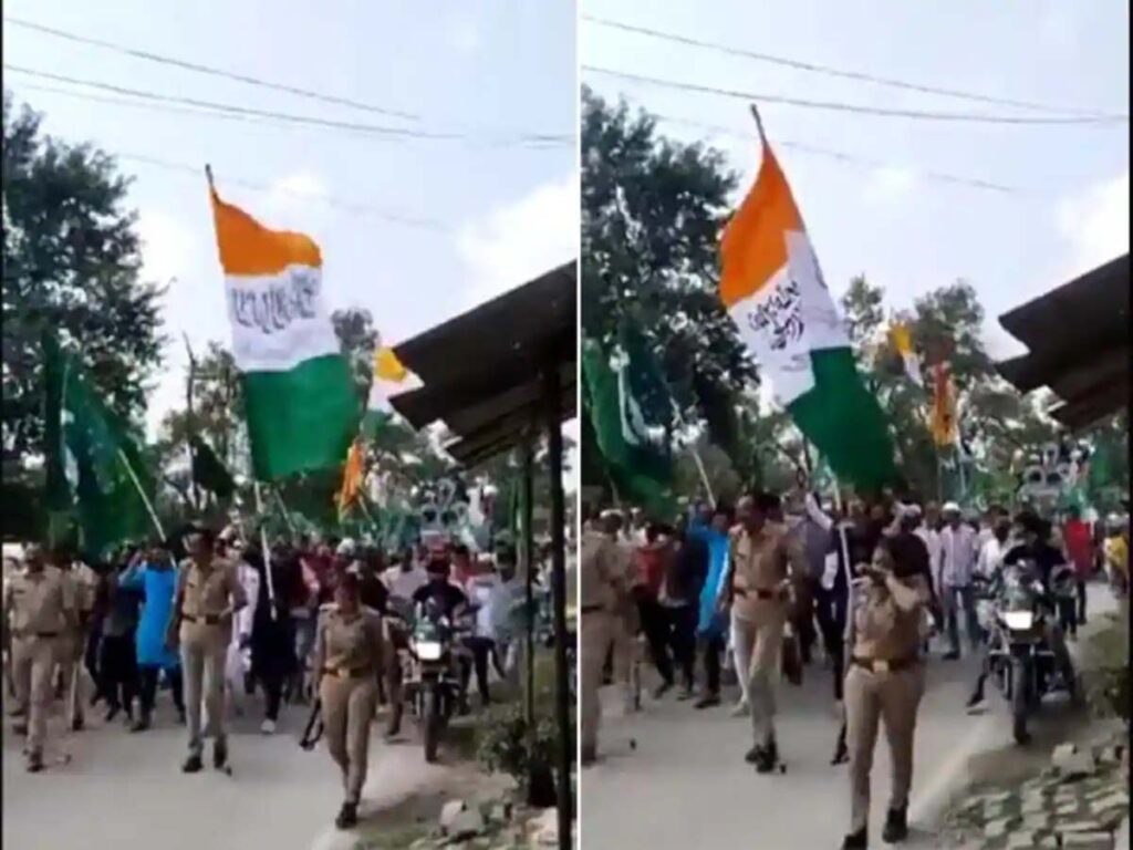 सोशल मीडिया पर वायरल वीडियो में दिख रहा है कि बारावफात का जुलूस निकाला जा रहा है। इस दौरान लड़कों के हाथ में कई तरह के झंडे हैं। इनमें एक हरे रंग के झंडे पर चांद और सितारे बने दिखे। इसके अलावा तिरंगे झंडे भी दिखे। हालांकि ये झंडे भारतीय झंडे की तरह नहीं थे। इनमें सफेद रंग पर बना अशोक चक्र नहीं था। अशोक चक्र हटाकर उसपर उर्दू में ला इलाहा इल्लल्लाह मोहम्मदुर रसूल अल्लाह लिखा हुआ दिखा।