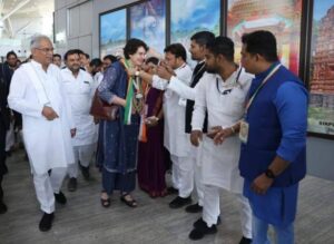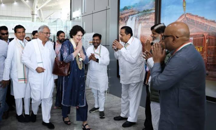 छत्तीसगढ़ के नवा रायपुर में हो रहे कांग्रेस पार्टी के 85वें पूर्ण अधिवेशन में हिस्सा लेने के लिए कांग्रेस महासचिव प्रियंका गांधी वाड्रा रायपुर पहुंचीं। इस दौरान एयरपोर्ट पर छत्तीसगढ़ के सीएम भूपेश बघेल भी मौजूद रहे। कांग्रेस नेता मोहन मरकाम ने प्रियंका गांधी वाड्रा को फुल देकर उनका स्वागत किया। वहीं प्रियंका गांधी वाड्रा के स्वागत में लिए एयरपोर्ट पर 20 टन गुलाब के फूल सड़क पर बिछाए गए थे। साथ ही उनके ऊपर भी फूलों की बारिश कर उनका स्वागत किया गया। इस दौरान एयरपोर्ट में समर्थकों की भारी भीड़ देखने को मिली। वहीं प्रियंका गांधी वाड्रा ने अपने सभी समर्थकों का अभिवादन किया।