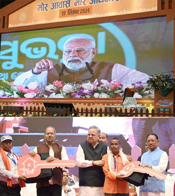 प्रधानमन्त्री श्री नरेंद्र मोदी ने आज अपने जन्म दिन के मौके पर छत्तीसगढ़ राज्य के 5 लाख 11 हजार से अधिक आवासहीन परिवारों को स्वयं का पक्का मकान बनाने के लिए पहली किश्त 2044 करोड़ रूपए की राशि सीधे उनके बैंक खातों में ऑनलाईन ट्रान्सफर की। मुख्यमंत्री विष्णु देव साय एवं अन्य मंत्रीगण की मौजूदगी में मोर आवास-मोर अधिकार कार्यक्रम राजधानी स्थित रायपुर के इंडोर स्टेडियम में आयोजित हुआ। प्रधानमंत्री नरेन्द्र मोदी इस कार्यक्रम में वर्चुअली शामिल हुए। उन्होंने आवास निर्माण के लिए चयनित हितग्राहियों को प्रथम किश्त की राशि अंतरित करते हुए हितग्राहियों को बधाई और शुभकामनाएं दी।
