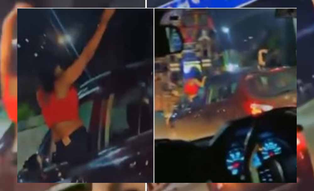 वीडियो में दिख रहा है कि एयरपोर्ट रोड पर रात के समय तेज़ रफ्तार कार की खिड़की से दो युवतियां बाहर निकलकर स्टंट कर रही हैं. पीछे चल रहे राहगीरों ने मोबाइल कैमरे में इस पूरे स्टंट को कैद कर लिया.