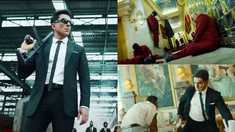 इसके बाद खून से सनी बॉडी को घसीटते हुए दिखाया जाता है, जिससे फर्श लाल हो जाती है। एक्टर इसमें एकदम सूट-बूट में नजर आ रहे हैं और सामने आदमियों की भीड़ को एक कमरे में धारदार हथियार से मार गिरा रहे हैं। किसी के सिर पर गोली मारते हैं तो किसी का चाकू से गला काटते हैं। नसीरुद्दीन शाह और विजय राज भी इसमें एक अहम किरदार निभाते दिखेाई दे रहे हैं। लेकिन सून सूद पूरे समय मारते दिखाई दे रहे हैं।