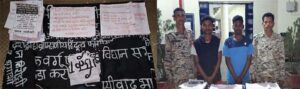 बीजापुर. जिले में चलाये जा रहे माओवादी विरोधी अभियान के तहत थाना बीजापुर, डीआरजी एवं बस्तर फाइटर की संयुक्त टीम पेट्रोलिंग पर नयापारा पामलवाया की ओर निकली थी।पेट्रोलिंग के दौरान गोरना-मनकेली की ओर जाने वाली सड़क पर सड़क किनारे पेड़ पर पम्पलेट बैनर लगाते कुछ संदिग्ध नजर आये जिन्हे संयुक्त पार्टी द्वारा घेराबंदी कर दो